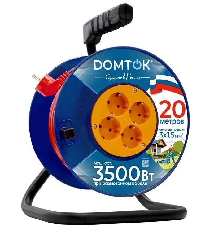 Удлинитель на катушке DOMTOK, 4х20м с заземл. 16А IP20 3,5кВт ПВС, 3х1.5, 2449